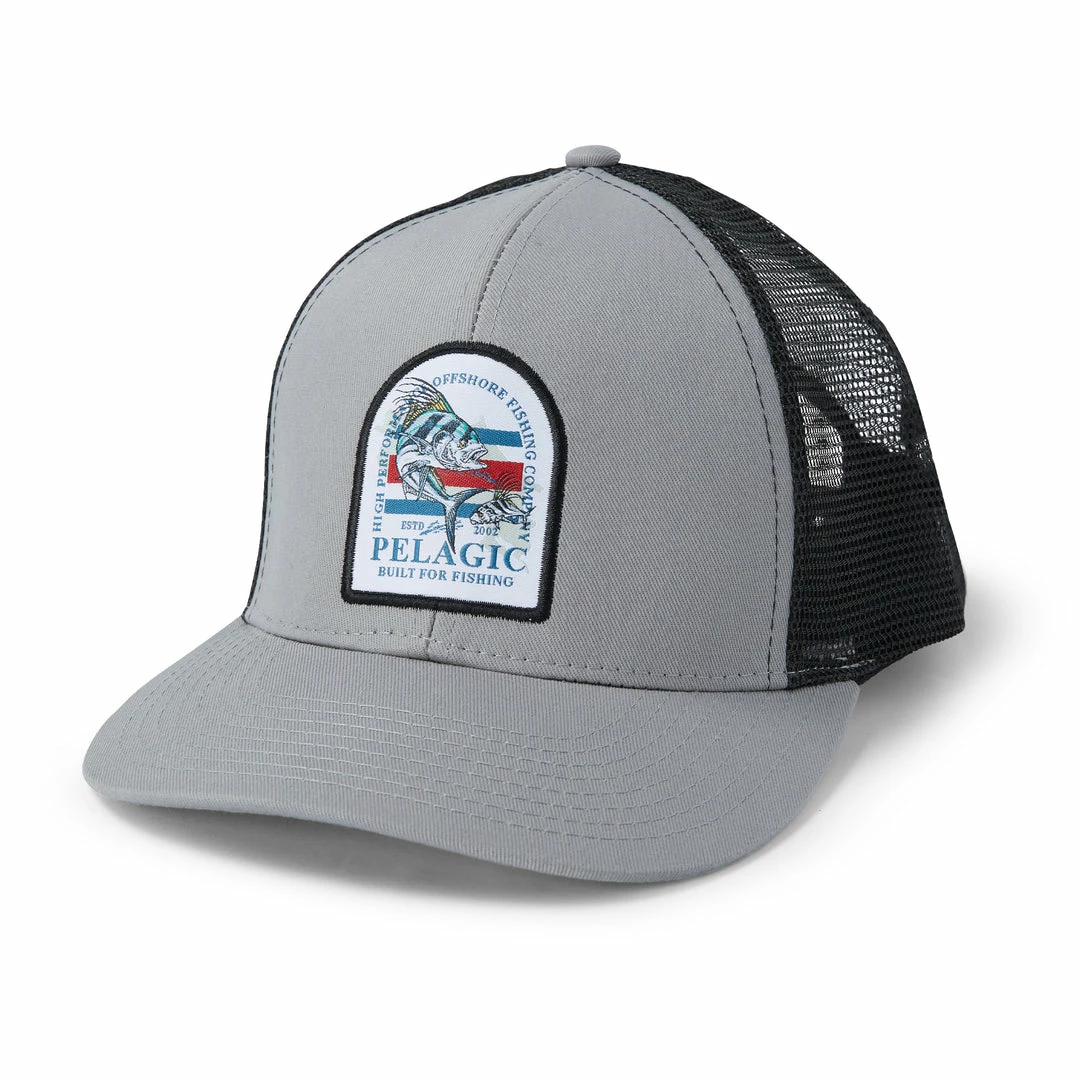 - Trucker hat featuring a front embroidered Cost Rica roosterfish patch