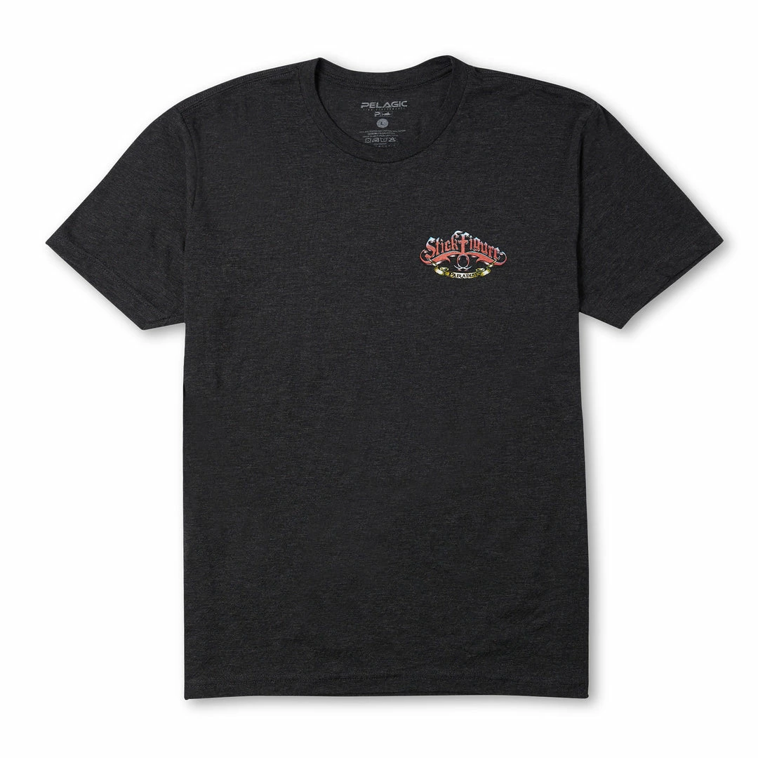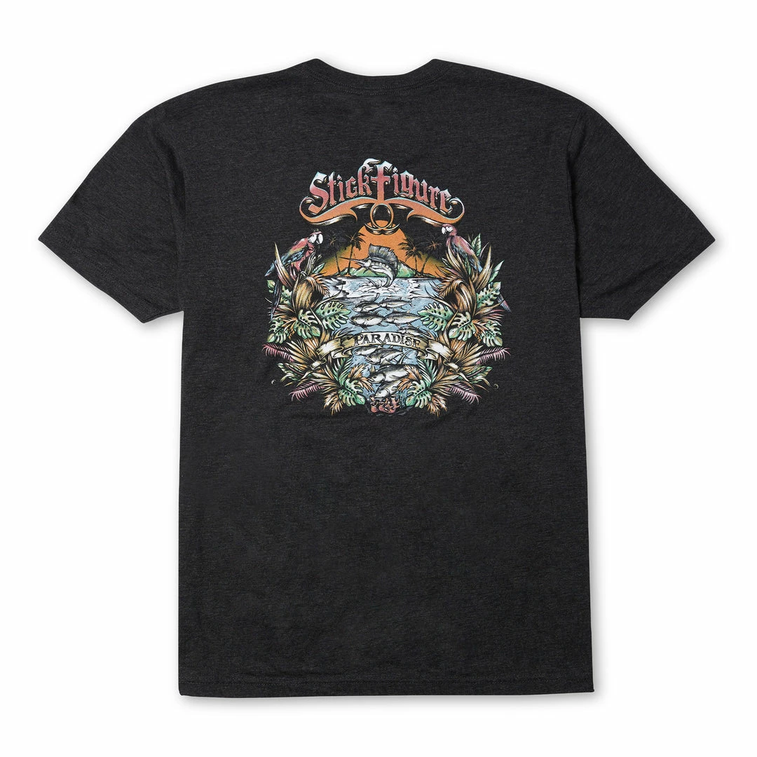 This limited-edition ultra-soft Tri-Blend tee features custom Pelagic x Stick Figure “Paradise” graphics with large print on back and front-left chest logo.