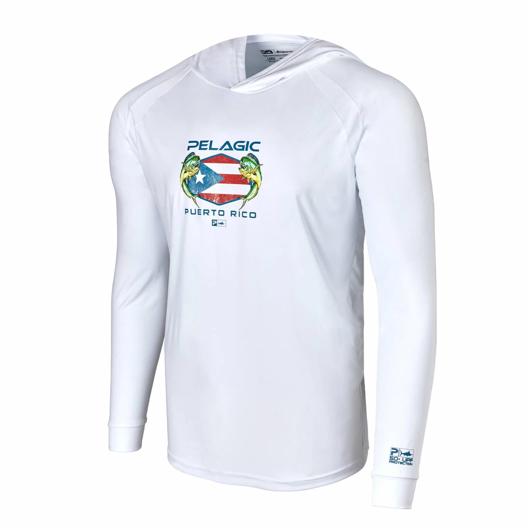 - Paying homage to Puerto Rico with dolphin fish graphics surrounding the Puerto Rican flag, stamped with the Pelagic logo